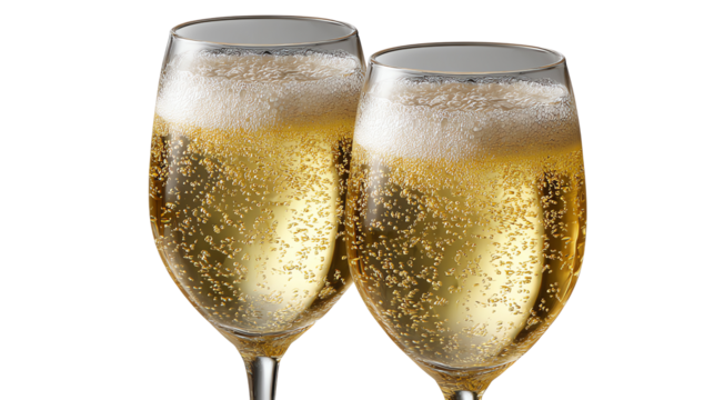 Bubbly Toast: Two crystal glasses clink together, overflowing with effervescent, golden champagne, celebrating a joyous occasion with its bubbly, festive cheer.