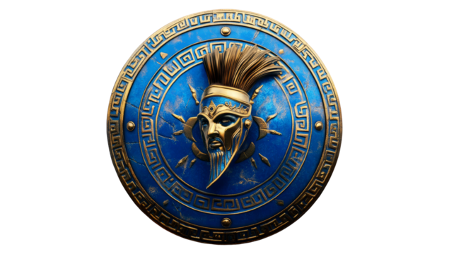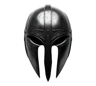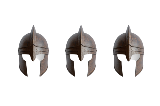 Close-up of an aged spartan helmet, showing signs of wear and tear, set against a transparent background
