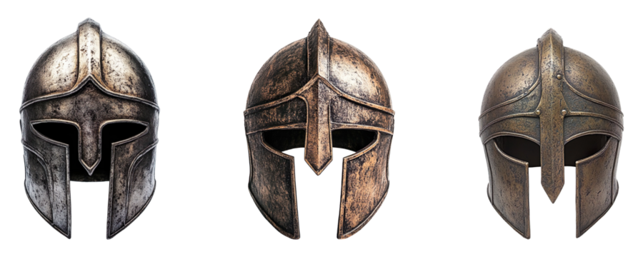 Bronze battle helmets with intricate engravings, perfect for historical themes