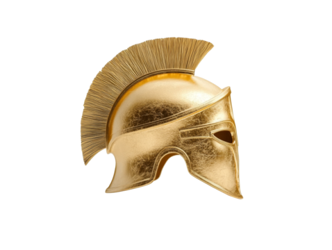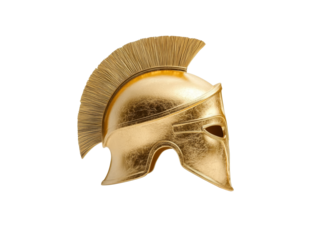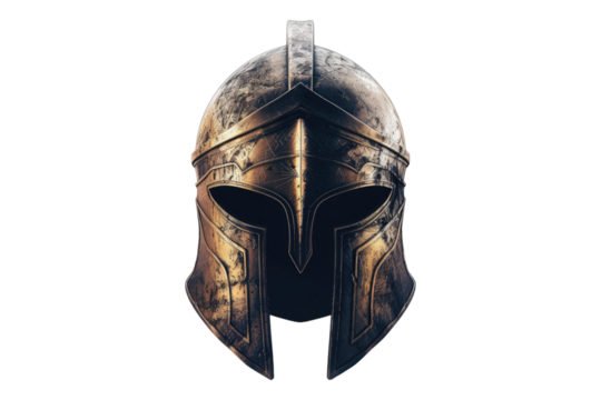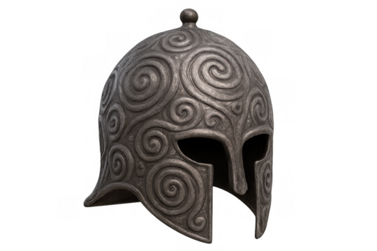 Metal spartan helmet with spiral patterns, isolated on transparent background, perfect for historical or fantasy projects