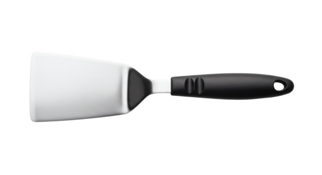 Isolated stainless steel spatula with black handle lies centered on a bright white background