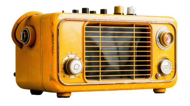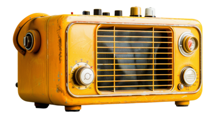 An old television with a wooden frame featuring multiple knobs and a textured speaker grille isolated on transparent background