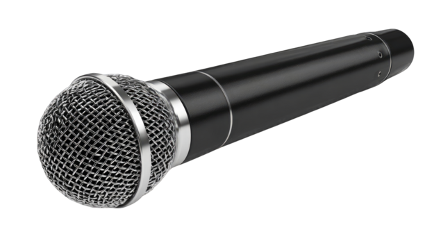 Black microphone with a silver grille perfect for music studio recording, podcasting, live performances, and professional speeches on stage.