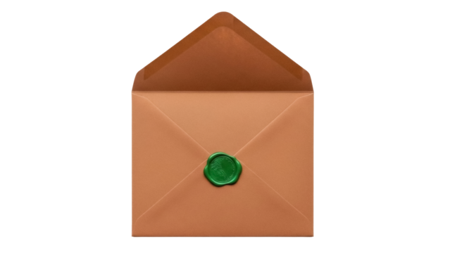 Open brown envelope with green wax seal isolated PNG, vintage stationery for invitations and special occasion correspondence