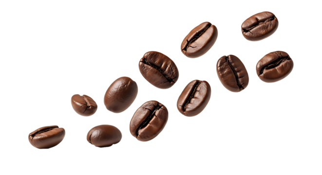 Close-up macro shot of rich, dark roasted coffee beans scattered and falling against a transparent background in studio lighting