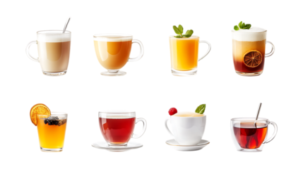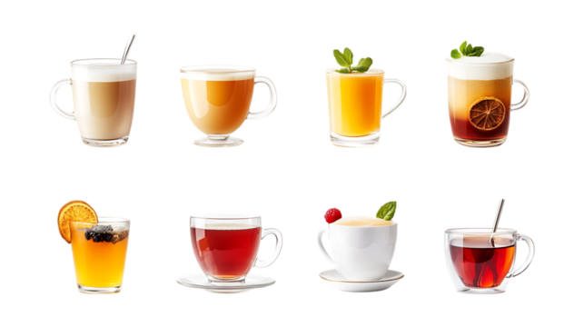 Pack Warm Beverage Set in Different Poses Against Transparent Background for Café Branding, Menu Design, or Cozy Lifestyle Promotions