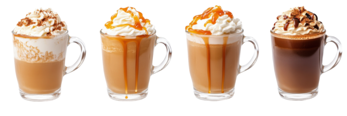Assortment of delicious caramel and whipped cream topped coffee beverages in glass mugs png