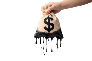 Dependence on fossil fuels: Wallet soaked in crude oil against a white background