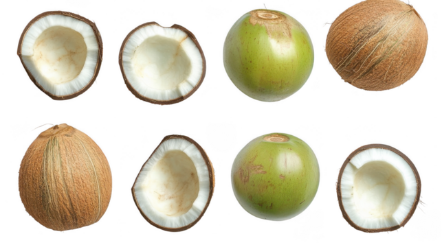 Various coconuts displayed with whole and halved specimens revealing their outer shells and inner flesh