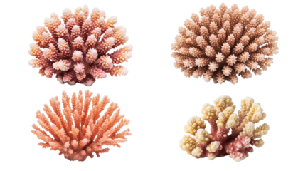 Four coral specimens in various shades of pink and beige, showcasing diverse textures and forms, isolated against a black background