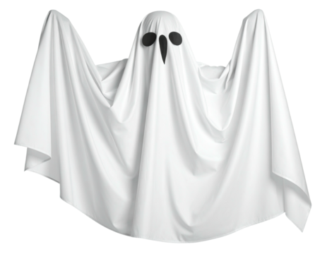 White ghost form shrouded by flowing fabric, eyeholes peering through
