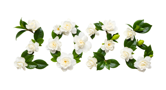 2026 spelled out with white gardenia flowers and green leaves, floral design for new year greetings and celebration