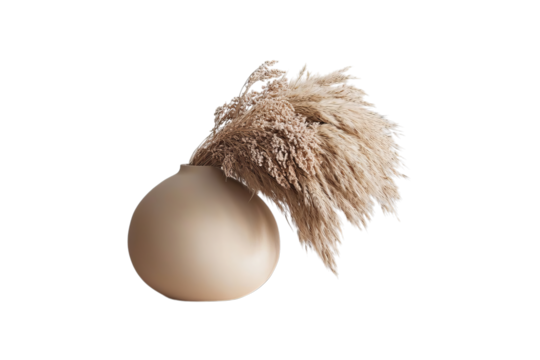Minimalist beige vase with dried pampas grass arrangement on white background, showcasing modern elegance in home decor