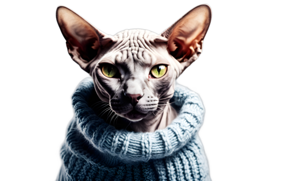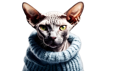 A Sphynx cat wearing a cozy sweater, isolated on a empty plain background