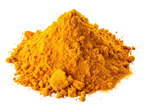 Turmeric powder spice in ceramic bowl with bright golden yellow ground texture herbal culinary ingredient used in cooking and health remedies isolated on transparent background