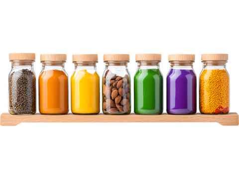 Wooden shelf with colorful spice jars isolated on transparent background, perfect for kitchen, recipe, and cooking visuals.