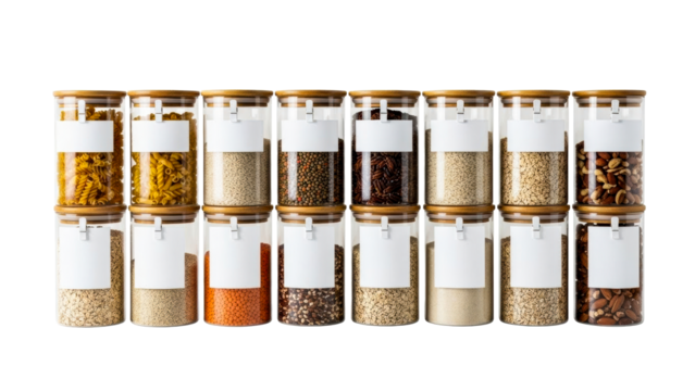 Four transparent spice jars with cork lids filled with various dried spices in a row isolated on white or transparent png.