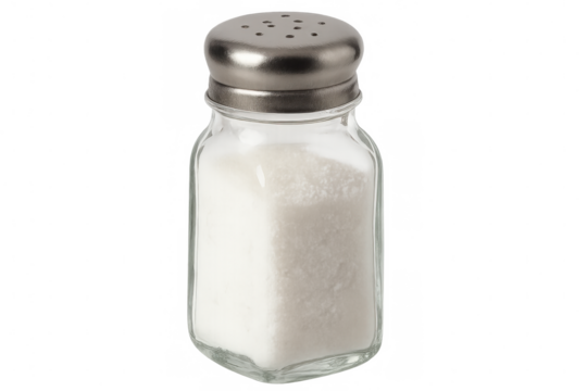 White salt crystals filling glass shaker with metallic perforated lid, positioned against transparent backdrop