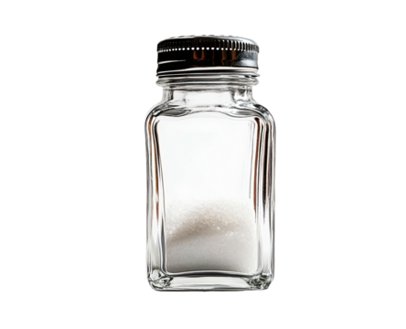 Salt shaker Square glass bottle filled partially with white grains, dark lid