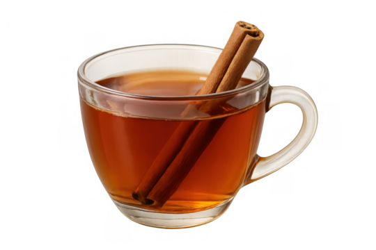 Hot tea in a clear glass mug with cinnamon sticks, offering a comforting and spiced warm beverage on a transparent background
