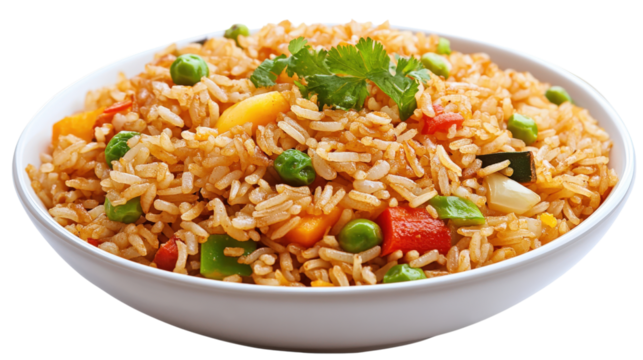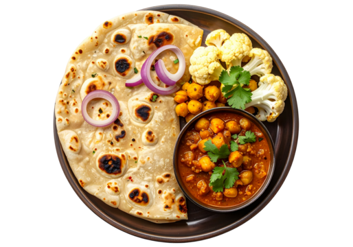 A plate with cauliflower curry, roti, sliced onions, cilantro, and green chilies on a white plate on transparent background