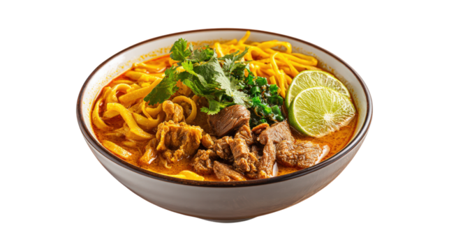 Northern Thai food (Khao Soi), Spicy curry noodles soup with chicken and beef collection isolated on a white background