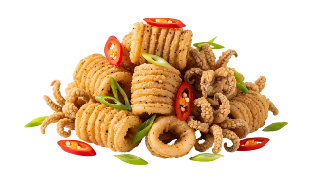 Ultra realistic spicy squid stir-fry with tender squid, chili sauce, vegetables, sesame seeds in a modern bowl on a transparent background, no shadows, professional food photography concept