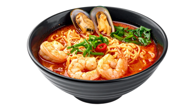 Flat icon of ramen bowl with egg and vegetables, transparent background