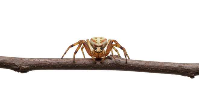 Camouflaged crab spider resting attentively on a brown twig against a clean white background, close up details and precise focus