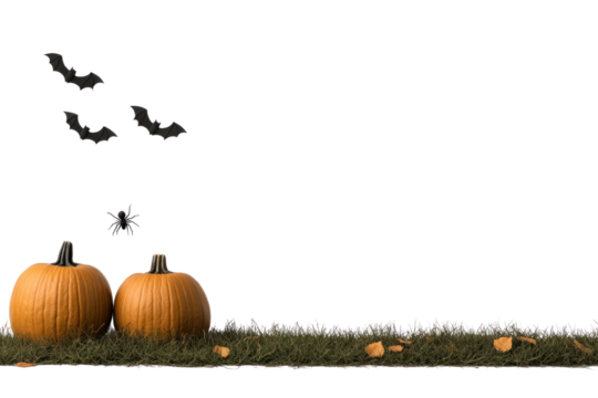 Halloween Scene: Two pumpkins rest peacefully upon a bed of grass, with the silhouettes of bats and a spider flitting above, creating a spooky, festive ambiance.