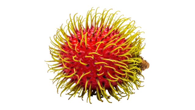 Vibrant tropical fruit with a red, textured rind and spiky, yellow hairs