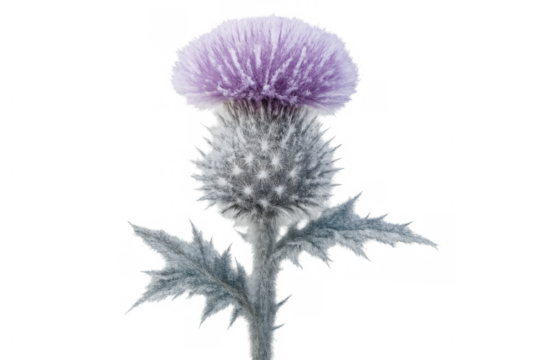 Vibrant purple thistle bloom showcases delicate petals and spiky green leaves, perfect for nature and botanical projects isolated on white background