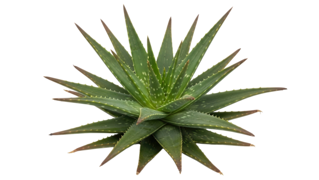 Aloe vera plant from top view showing green spiky leaves, cut out, stock png, isolated on transparent background