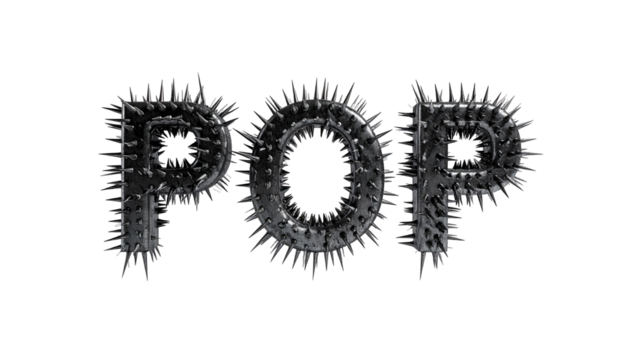 Metallic, spiky letters spell "POP" against a stark, black background
