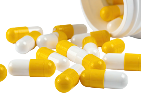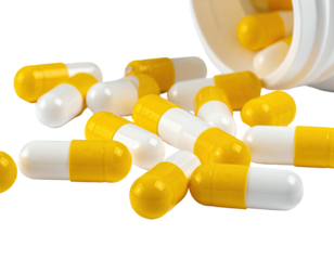 Close-up of scattered white and yellow capsules.  A white plastic bottle is partially visible, suggesting the capsules are spilling out