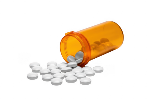 White pills spilling out of an orange bottle medication isolated on a transparent background