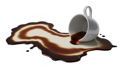 Spilled coffee mug on surface, brown liquid spreading with single coffee bean, representing accident, mess, or morning mishap.