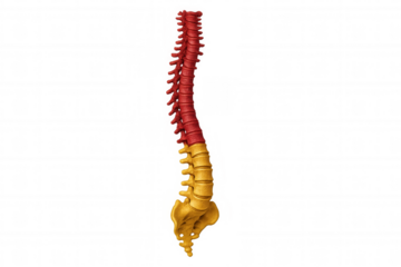 Human spine anatomical model showing vertebral column structure, medical biology, and bone anatomy on transparent background