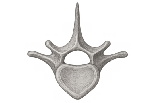 Thoracic vertebra anatomy drawing illustrating a human spine segment with bone structure detail for medical and educational purposes