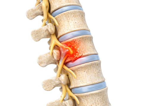 Lumbar spine disc herniation anatomy with nerve compression inflammation pain detailed medical illustration isolated on white background