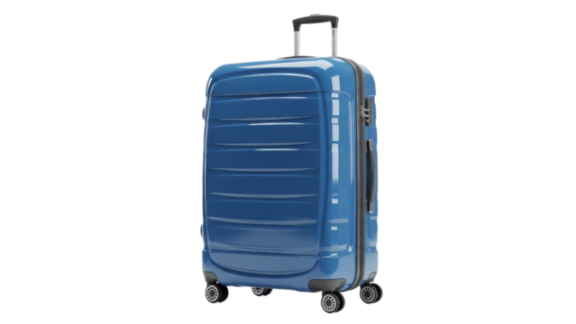 A blue hardside spinner suitcase with an extended handle  isolated on transparent background, png