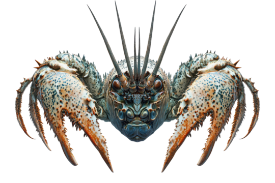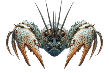 Detailed close up of a spiny lobster with large claws isolated on transparent background. Spiny lobster isolated on white background.