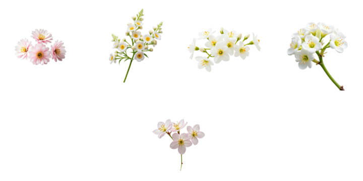Collection of spiraea nipponica flower clusters isolated on a transparent background showcasing delicate white petals and green stems in spring arrangement.