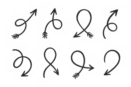 Black hand-drawn doodle arrows with various spiral and loop shapes, pointing in different directions. Transparent background