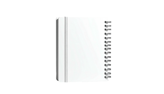 Open spiral notebook with clean white pages and black rings centered. Perfect for educational, office, or note-taking visuals. Isolated on transparent background. PNG