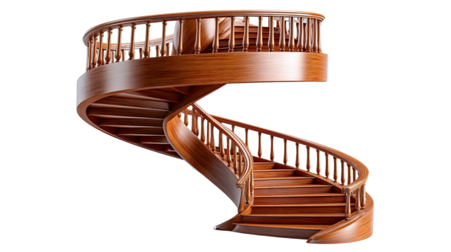 Elegant Spiral Staircase: A beautifully crafted wooden spiral staircase, with its intricate design and warm tones, leads upwards in an inviting display of architectural artistry.