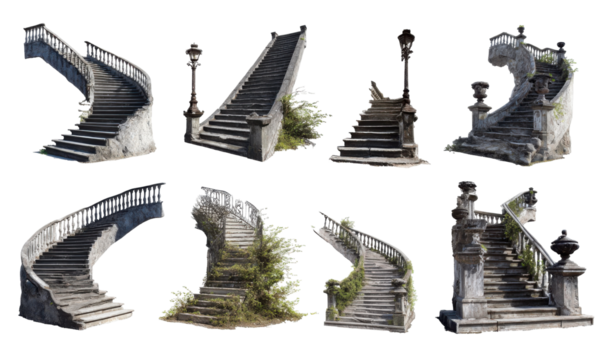 Set collection of circular spiral curved curvature wood wooden step stairs stairway staircase, front view on transparent cutout PNG.
