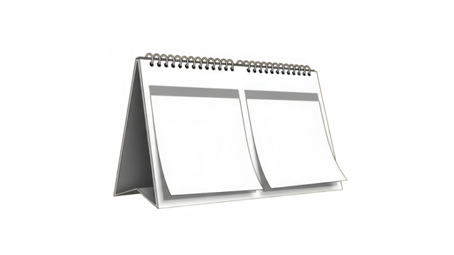 3D mockup of a blank standing desk calendar with spiral binding on isolated background. Ideal for branding, stationery design, schedule templates, office planner or notepad and product presentation.