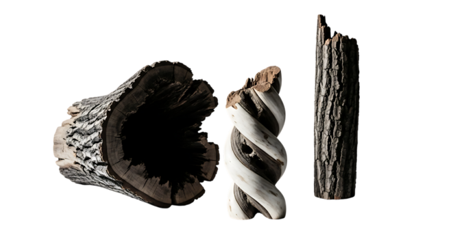 Three different pieces of wood, including a hollowedout log, a twisted branch, and a piece of bark, isolated on transparent background
