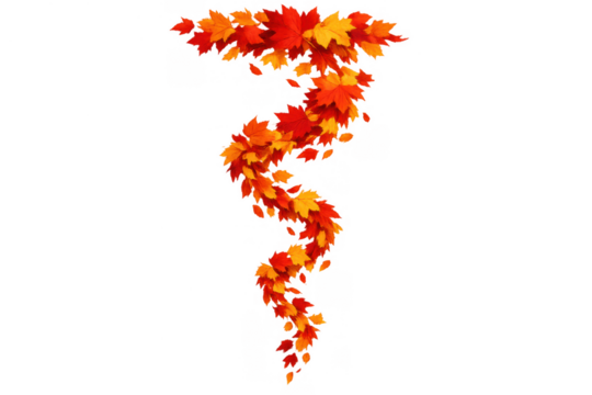 Autumn maple leaves in vibrant red, orange, and yellow swirling, forming a decorative spiral design with a transparent background